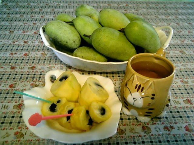 私は、美味しいわ!と2ついただきました。でかい黒い種がゴロンゴロン入ってるのでアケビより食べるのも楽です。いつもは、このように品良く剥きもせず、とりたてを手で剥いてガブッと食して種をお庭の隅にポイ、ですね^^
