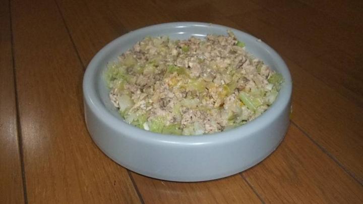 材料は鶏胸肉,レバー,キャベツ,じゃがいも,卵黄,卵殻粉,オリーブ油。