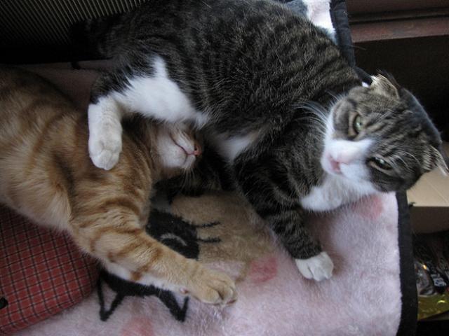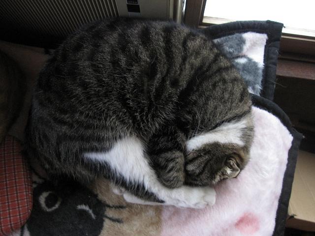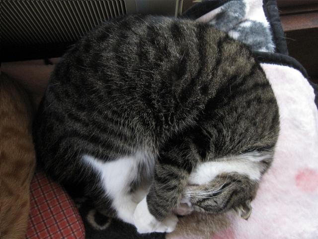あ~っ 隣で寝ていた茶々が寝返りうって志づのおしりに頭突き!