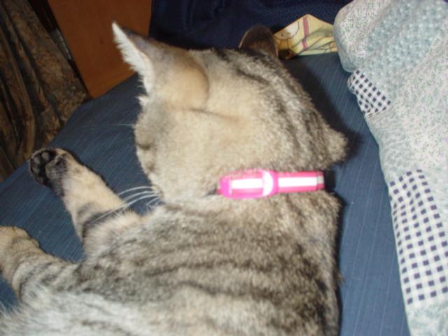 お母さんがね、「ニャアちゃん、これノミ取り首輪だけど、しててもらえる?ニャアちゃんにノミがいたことないんだけど、これしてるとうちの子だっていう印だから。」だって。