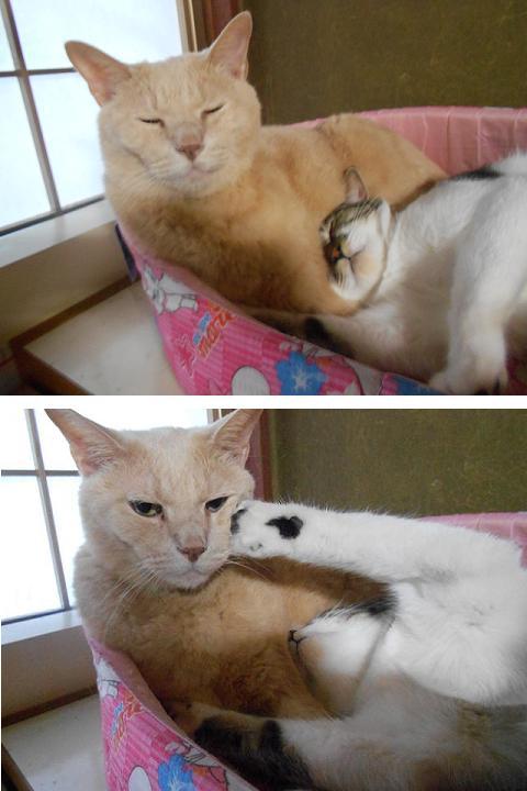 仲良しまなちゃんと。気持ちよく寝ていたのに突然の張り手。