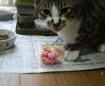 直ぐ近くに猫草も置いてあって食べるのですが、バラも捨てがたいのか飾るたびに必ず食べています。