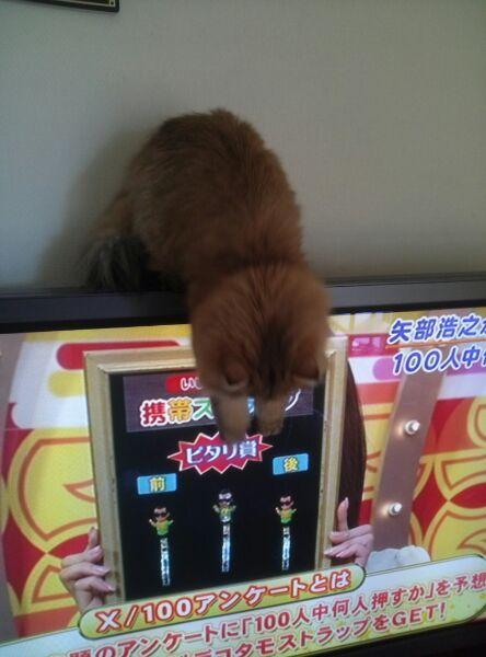 テレビ画面に手をついて真っ逆さまに滑って着地。
