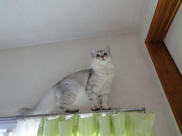 まだ、カーテンレールの上から降りるのは苦手・・・にゃん!