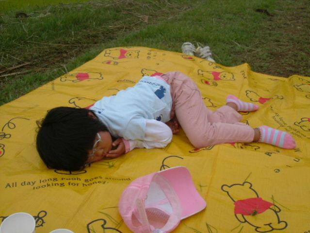 遊びつかれた娘は池のほとりでお昼ねです。ねぞうが悪いので池に落ちないかヒヤヒヤもんでした。