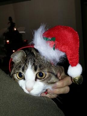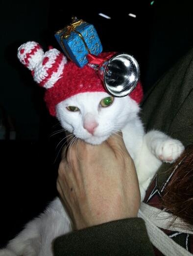 クスクスのお誕生日に編んだ帽子にちょっと鈴とプレゼントくっつけました