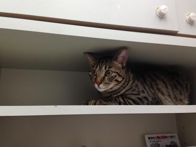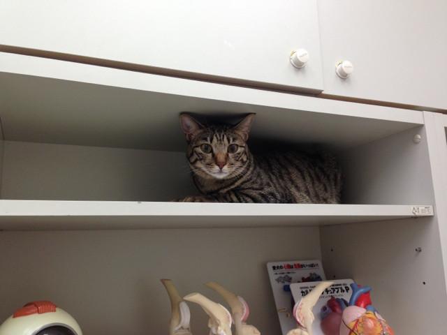 先生が注射(制吐剤)の用意をする間、診察室の棚に