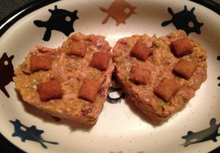 みーは、ウェットフードが大好きです。しかし、カロリーが少し高いので…ドライフードをお湯でふやかして半々でウェットフードと混ぜてあげました!鰹節も混ぜて、お高めなシーバを添えて…