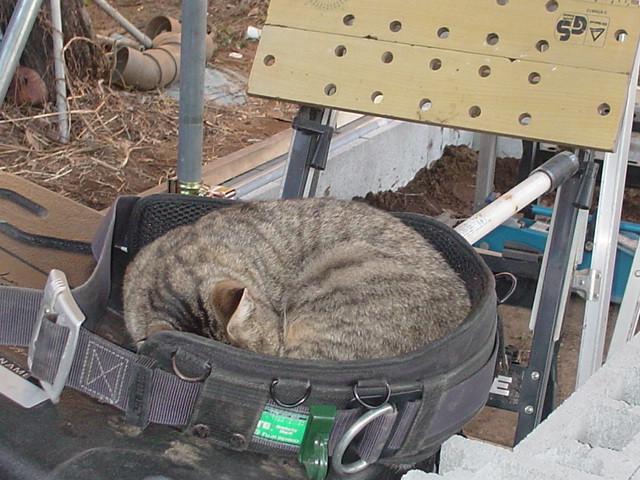 確かに安全帯だけど、周りで電動工具使ってるのにくつろぐニャアちゃんって、やっぱりすごいね。