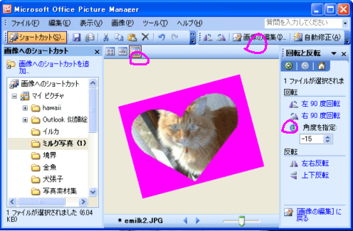 1.スタート→すべてのプログラム→マイクロソフトオフィス→オフィスツール→ピクチャーマネージャーで開いて、作った写真を開いて、画像の編集→回転と反転で、角度を指定の下に数字を入力してください。