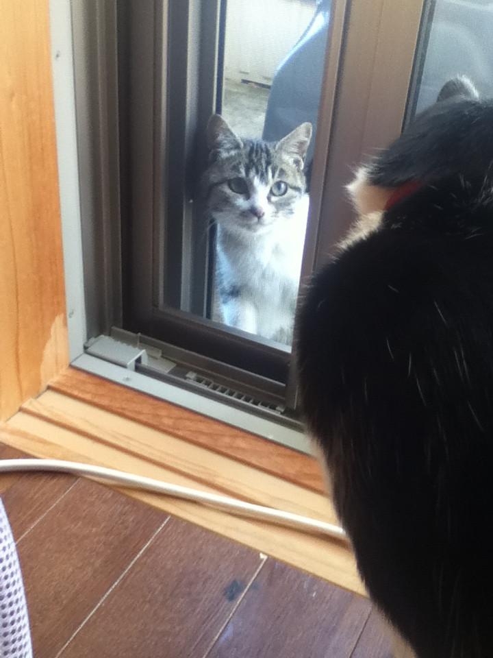 朝、サスケがソワソワしだして様子がおかしいと思ったら、シロキジがリビングの窓の外にいて、ニャーニャー言ってる!!!! 窓越しのサスケと対面!