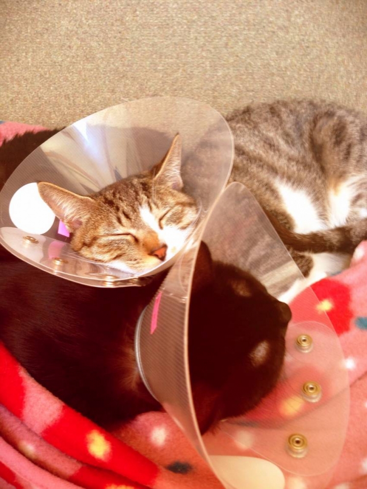 1週間後に抜糸。それまでこのエリザベスカラーをつけなければいけません。