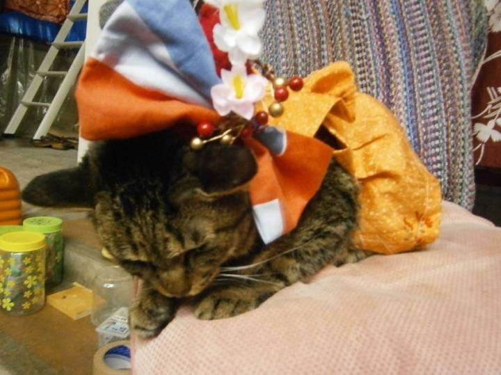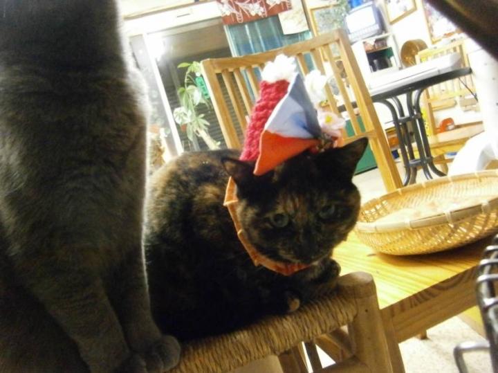 オハナにかぶせてみた(クリスマス帽に正月飾りとリボンをつけただけ)