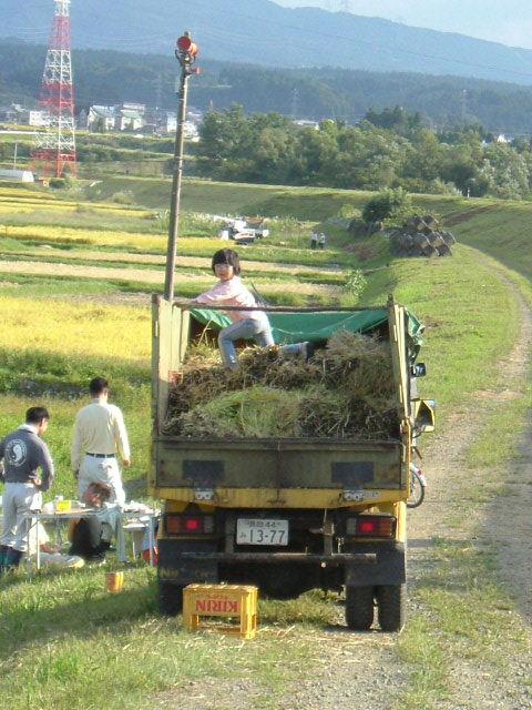 刈り取った稲を家のダンプに積んで運びます。この光景を見たとき、なんでか解かりませんが「大草原の小さな家」を思い出しました。子供も時良く見てたなー、あんなおとーさんがいたらなーって思ってました。「インガルス一家」知ってますか?メアリーにローラにキャリーだったかなー?三姉妹でしたよねー。