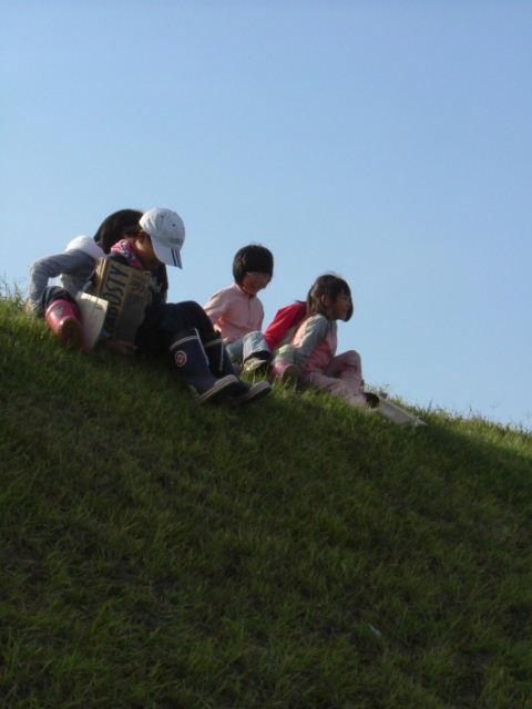 作業に飽きた子ども達は信濃川の土手でダンボールに乗って滑り台です。結局こうなるんですね、最後までちゃんとやれよなー、もー(`´メ)