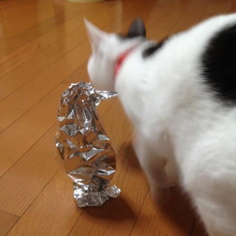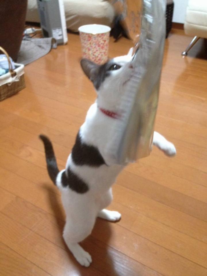 私が離れると、「遊んで~」と寄ってきたので、久びさにホイル玉でも作ろうとホイルを破いたとたん