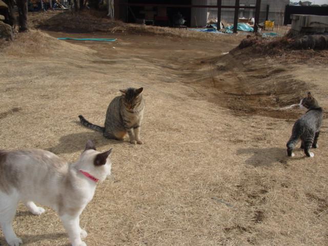 チビ達は2~3m離れたところまでで止まっていましたが、ニャアちゃんはそのまま、義父の傍でうろうろ。