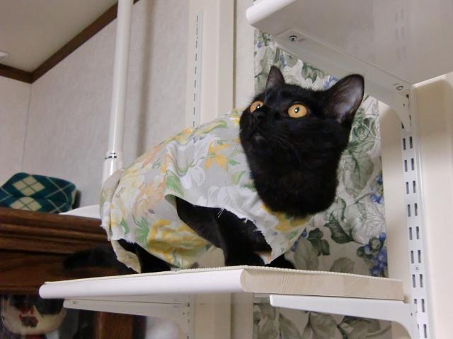 断脚・避妊手術から3日間は、大人しかったナイル。4日目の朝、目覚めると術後服がベッドに脱ぎ捨てられている・・・。