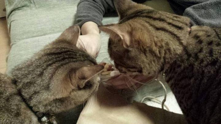 ダンナさんが開けたおせんべいに群がるドラニコ。