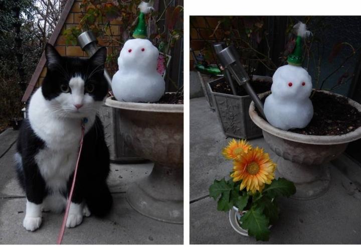 管理人の車に乗った雪をかき集め、雪だるまを作った。