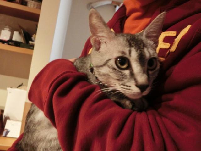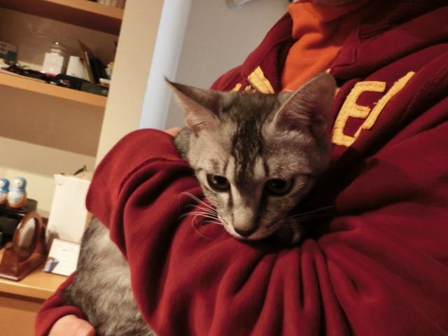保護主さんと私をみて、カーテンに隠れてしまいました。