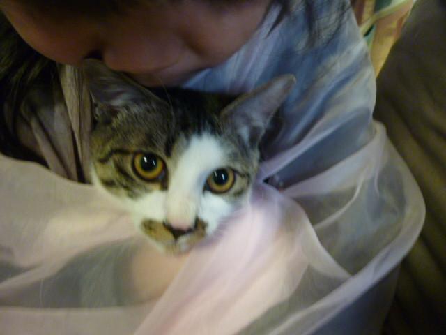 お姉ちゃんが身にまとって遊んでる布にそらが大興奮!