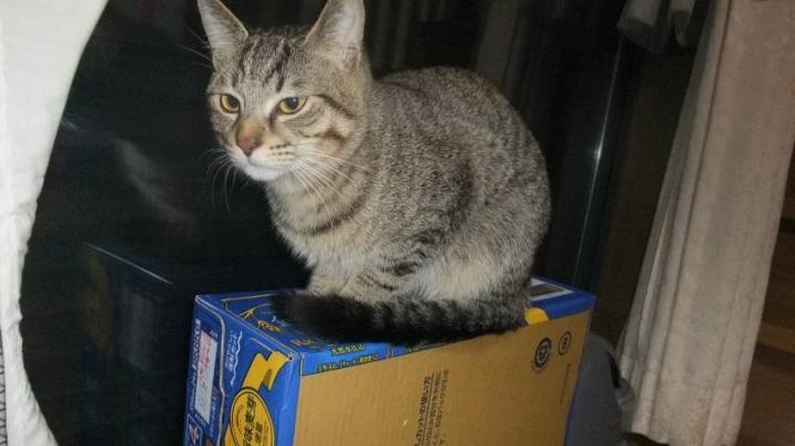 アロマはそうでもないのにコロンは箱の上が好きです。