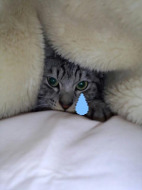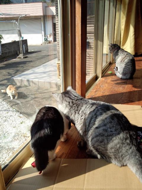のらちゃんをこんな近くで見たことないので 兄弟ねこは緊張して動けないようです。