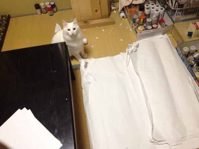 パパのプラモデルの箱が置いてあったり、プラモデルの塗装で使う紙が無造作に置いてあるだけなのですが、