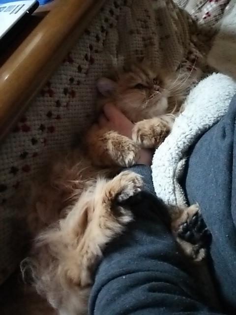コタツと飼い主のお腹の間にスッポリ‥ZZZZ