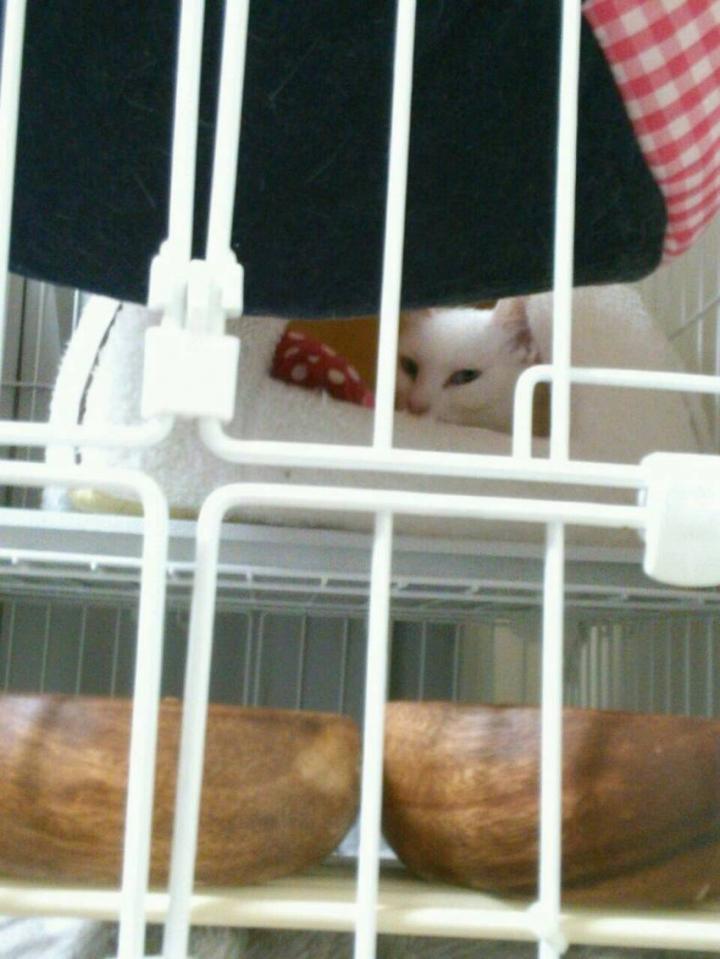 ケージに戻ってきたマリーちゃん、、と後に続く野次馬猫たち(笑)
