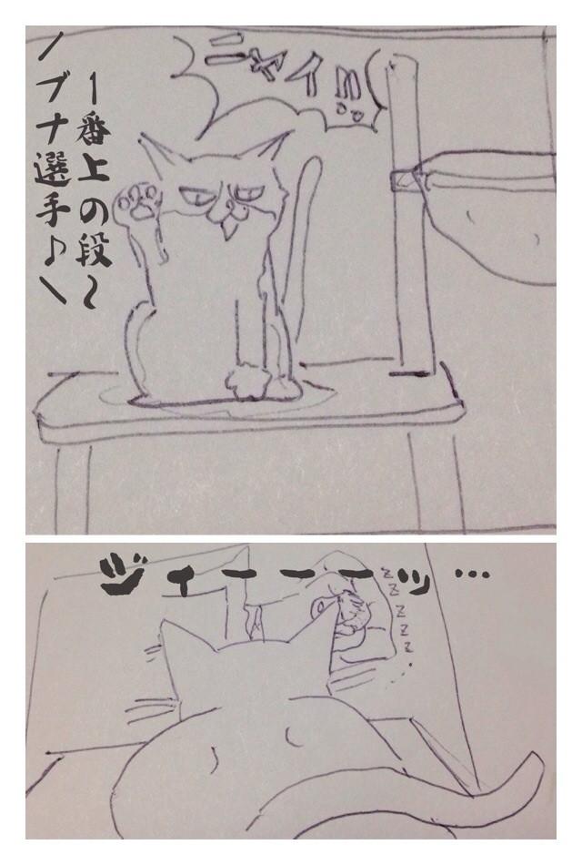 納得はできないらしく、キャットタワーからうたた寝しているカモちんを見守る。のかと思いきや…