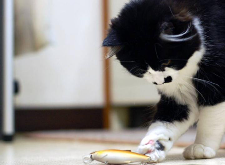 ↑短い手で鮎型のルアーと遊ぶ(針は外しています)
