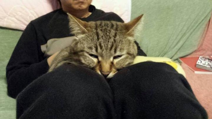 ワタシたちの膝の上に来ると、何故か自分の腕を足の間に通したがるんです。