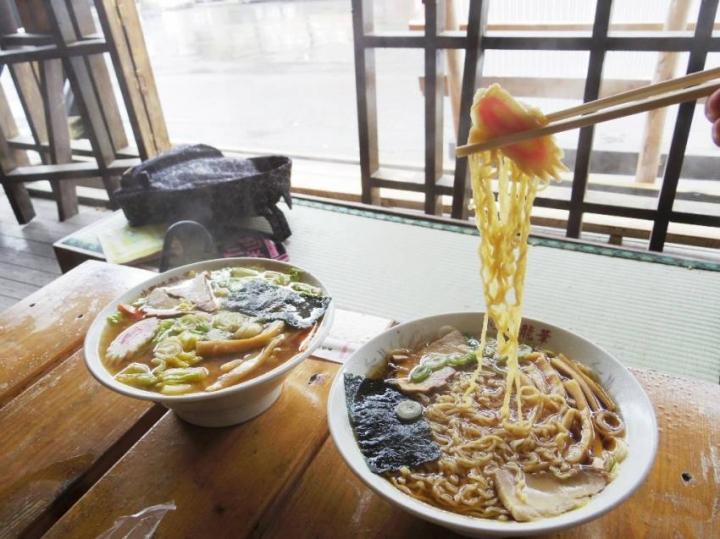 足湯の所で、電話をしたら出前してくれると聞き、早速ラーメンの出前。