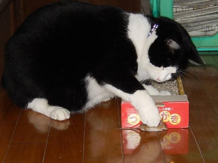 たまに、新聞紙入れの下に潜るので、新聞紙を束ねて出してやった。