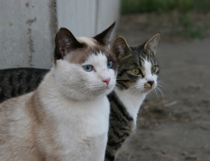 性別、毛色、毛質、目の色、しっぽ、体格、食べ物の好み、トラは早起き、白は朝寝坊・・・何もかも違う二人。