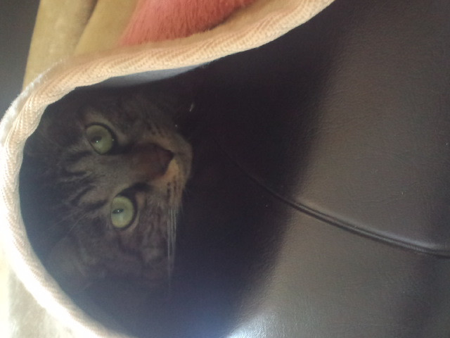マリンさんに対抗して1階のソファーと敷物の間に潜って
