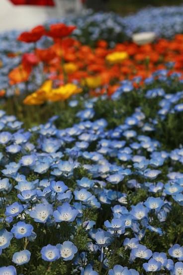 こちら花壇に寄せ植えのネモフィラ・ポピー・キンセンカなど