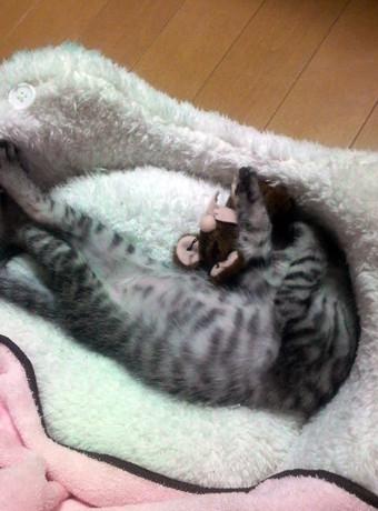 この一緒に寝てるおもちゃ、保護主さんがくださったのですが蹴ったり転がしたりするとチューチュー言うんですね!子猫ちゃんのお気に入りです♪寝てるからそっとしておこう、と私が自室に戻っていると、しばらくしたら隣の部屋からチューチュー聞こえてきたのには大笑いしてしまいましたヽ(=´▽`=)ノ
