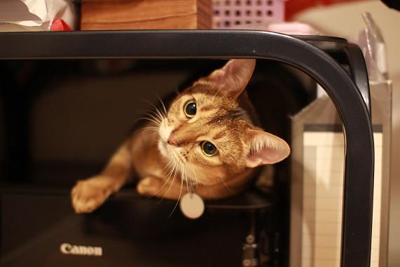 ここは遊びの最中、追い詰められて逃げ込む プリンターの上です♪