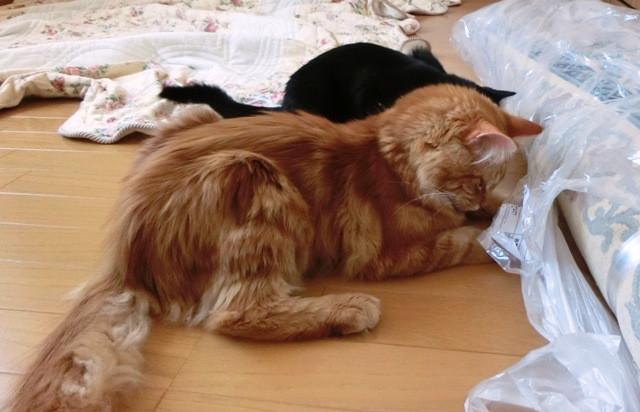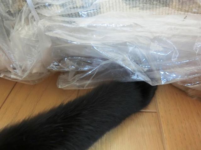 ラグと梱包のビニールの間に挟まってもぞもぞしている。