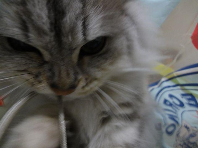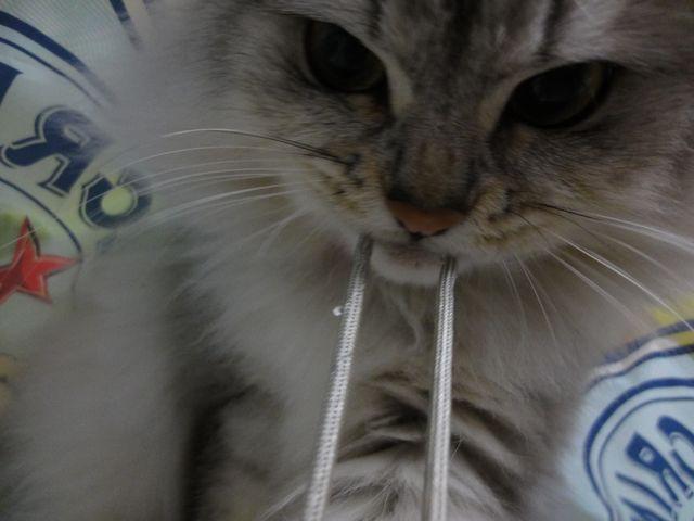 猫バス?の中でカメラのヒモをハミハミしてます。
