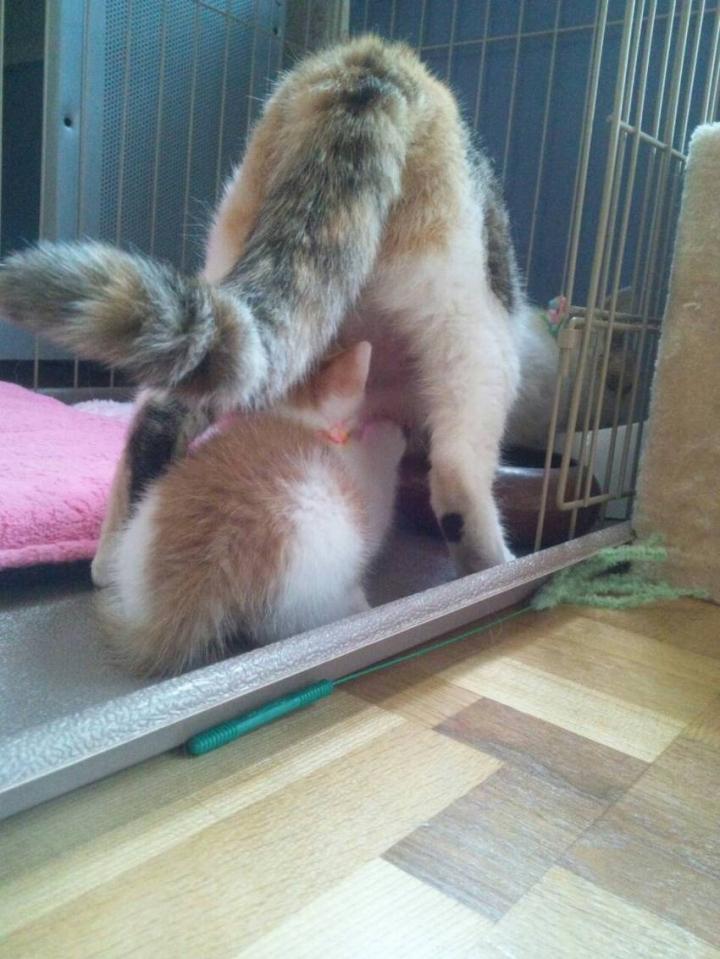 餌を食べているおかさんm(__)mの迷惑も関係なくオッパイ飲んでいます。