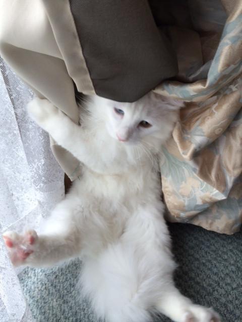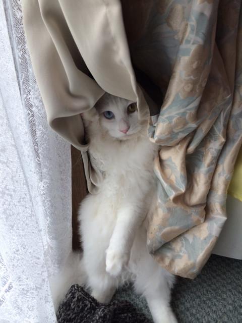 マロとティッシュケースの撮影をしている頃、マリーはカーテンとミシンの間に挟まってもふってました。