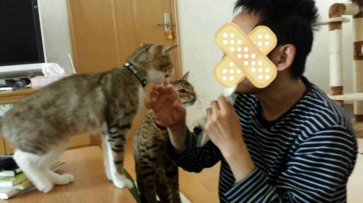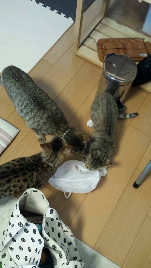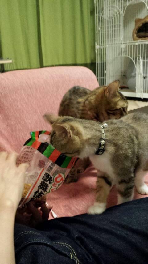 三ニャン坊のサクちゃんも思いの外食い意地がはってまして(笑)、時々我が家はこんな光景に↓↓↓