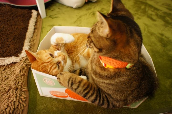スタッフ猫つぶとのみかん箱争奪戦。