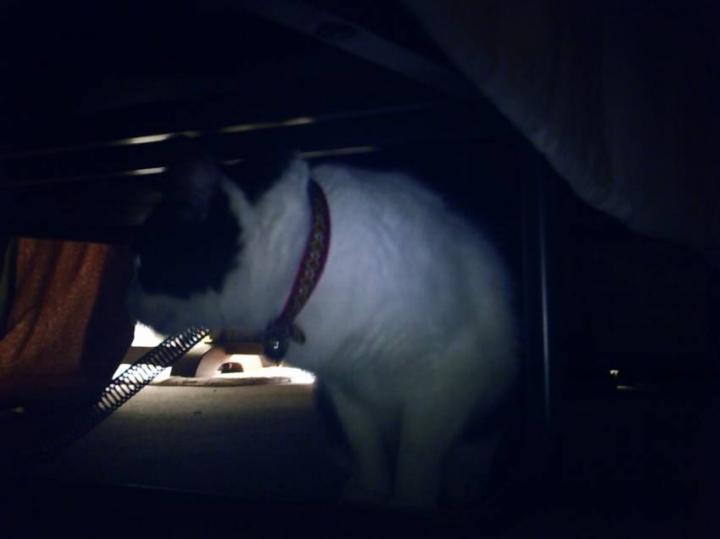 怖かったのか再びベッドの下へ…。