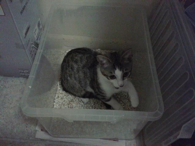 昨夜読ませていただいた日記の中に、透明のプラスティックの箱をトイレにする、というアイディアに、(おぉ!)と思い、ルの『狭い流しでウンチ問題』のため バスルームにトイレを移動していて、(でも、もし習慣で 夜中に台所にトイレに行ったら・・・)と不安だったので、早速、その透明の箱の中にトイレの石を半方に敷き詰めて 置いてみました。