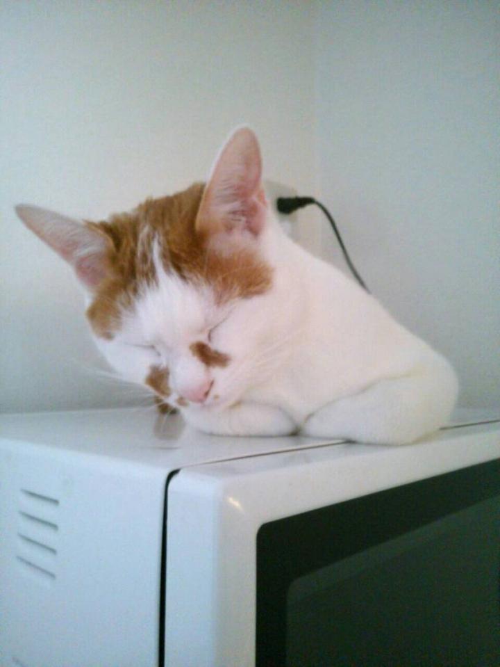 どうやら電子レンジの上は眠気を誘うらしいw 傾いてます(笑)
